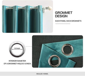 2 PCs Stainless Ring Eyelet Velvet Curtains With Velcro Belts - Blue Teal